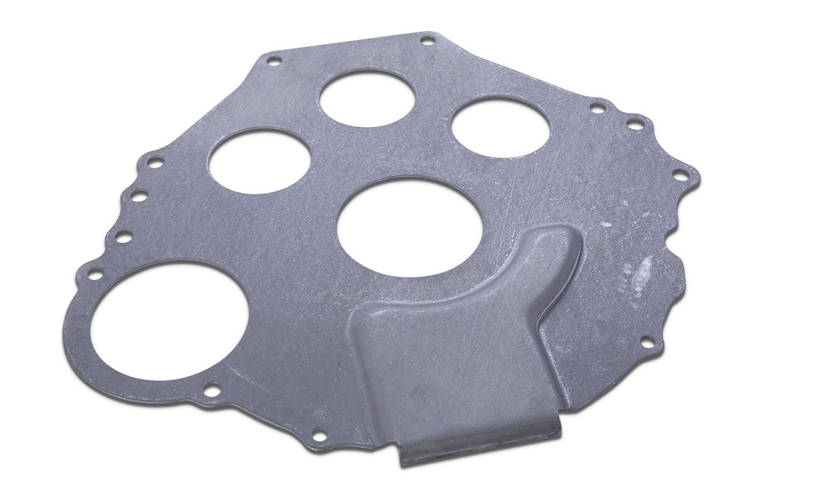 - Metal plate that goes between the block and the transmission bellhousing